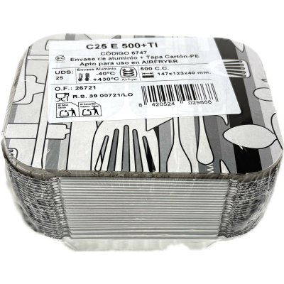 C25E 500+TI - Envase de aluminio rectangular con borde rizado con tapa de cartón 147x123x40 mm